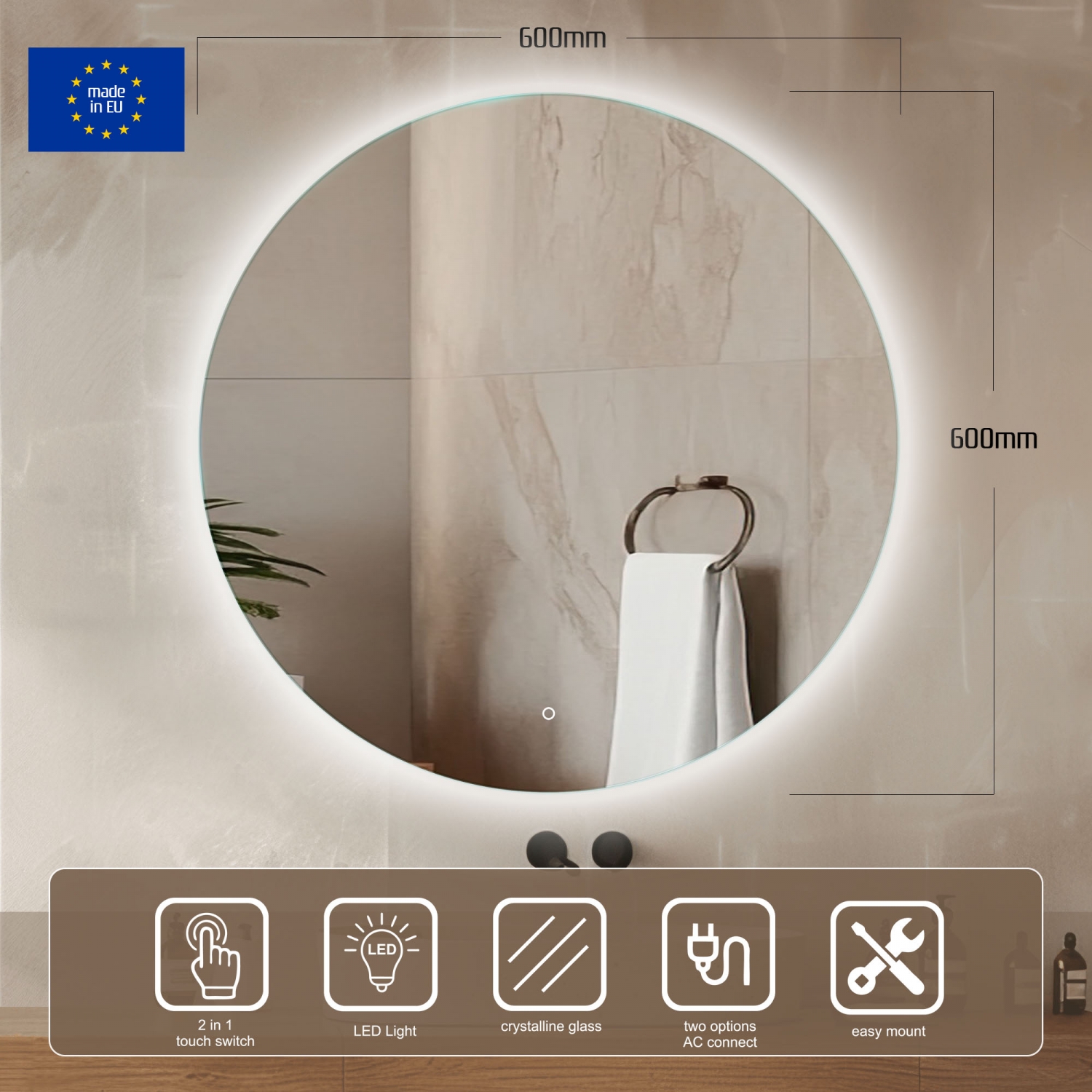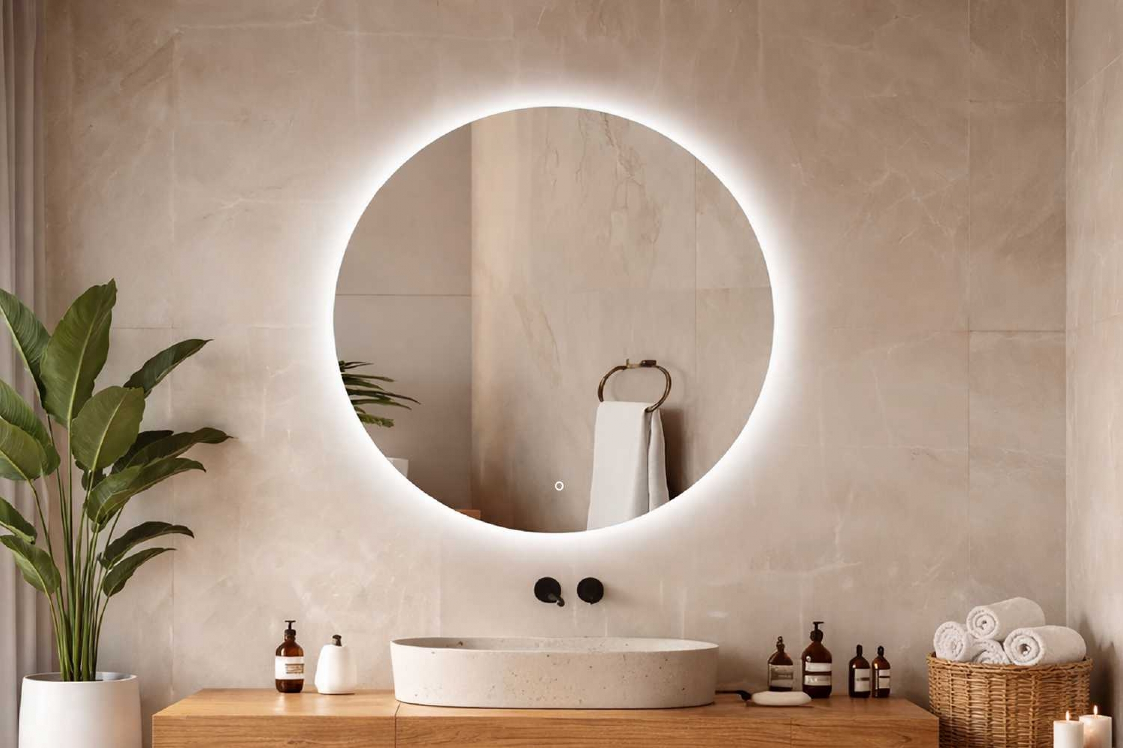 Lustro Koło Led to nowoczesny i stylowy element wyposażenia wnętrz, który łączy w sobie funkcjonalność i elegancję. Wyposażone w innowacyjne oświetlenie LED, oparte na najnowszej technologii równomiernego rozłożenia światła, zapewnia idealne oświetlenie przestrzeni wokół. Dzięki temu lustro jest nie tylko praktyczne, ale również doskonale podkreśla charakter wnętrza.Tym, co wyróżnia model Koło Led, jest subtelne, tylne podświetlenie, które tworzy delikatną, efektowną łunę światła wokół krawędzi tafli. Taki efekt wizualny sprawia, że lustro staje się ozdobą zarówno w łazience, jak i w przedpokoju, gabinecie czy sypialni, wprowadzając do pomieszczenia nowoczesny i nastrojowy klimat.Dodatkową zaletą lustra jest dotykowy włącznik, który pozwala na wygodne uruchamianie oświetlenia, zapewniając intuicyjną obsługę. Wysokiej jakości materiały oraz precyzyjne wykonanie sprawiają, że lustro Koło Led to trwały, elegancki i funkcjonalny dodatek do każdego nowoczesnego wnętrza.