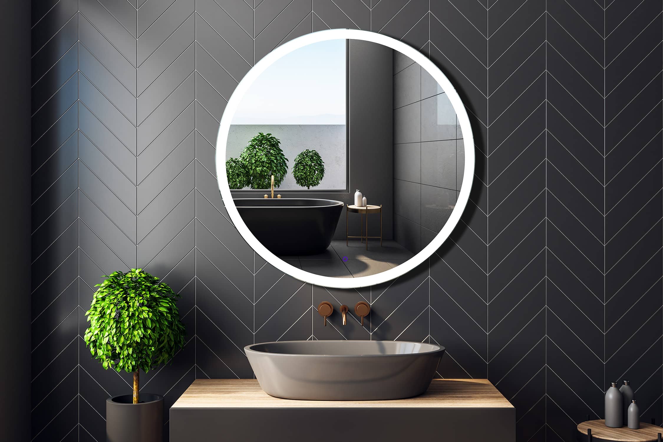 Lustro łazienkowe z wbudowanym oświetleniem led oparte na najnowszej technologi równomiernego rozłożenia światła. Wypiaskowany i podświetlony wzór po obwodzie lustra optymalnie oświetla twarz przy codziennym użytkowaniu. Oświetlenie lustra w tym modelu spełnia dwie funkcje: oświetlenie twarzy oraz podświetlenie ściany wokół tafli co nadaje pomieszczeniu niezwykle dekoracyjnego efektu. Oświetlenie uruchamiane jest za pomocą włącznika dotykowego led. Lustro o nowoczesnym, minimalistycznym kształcie koła o średnicy 80 cm stworzone dla poszukiwaczy nowych trendów. Efektowny i starannie wykonany model wysoko oceniany przez naszych klientów.