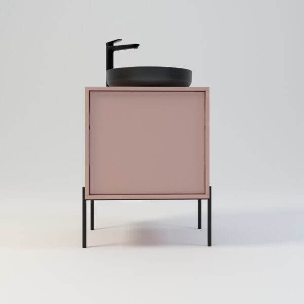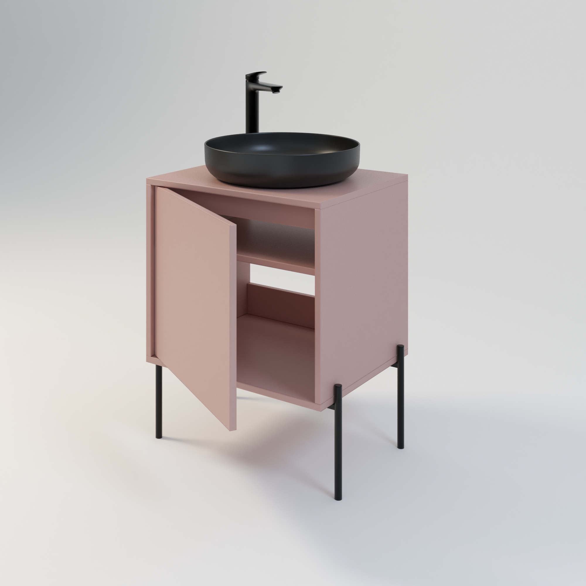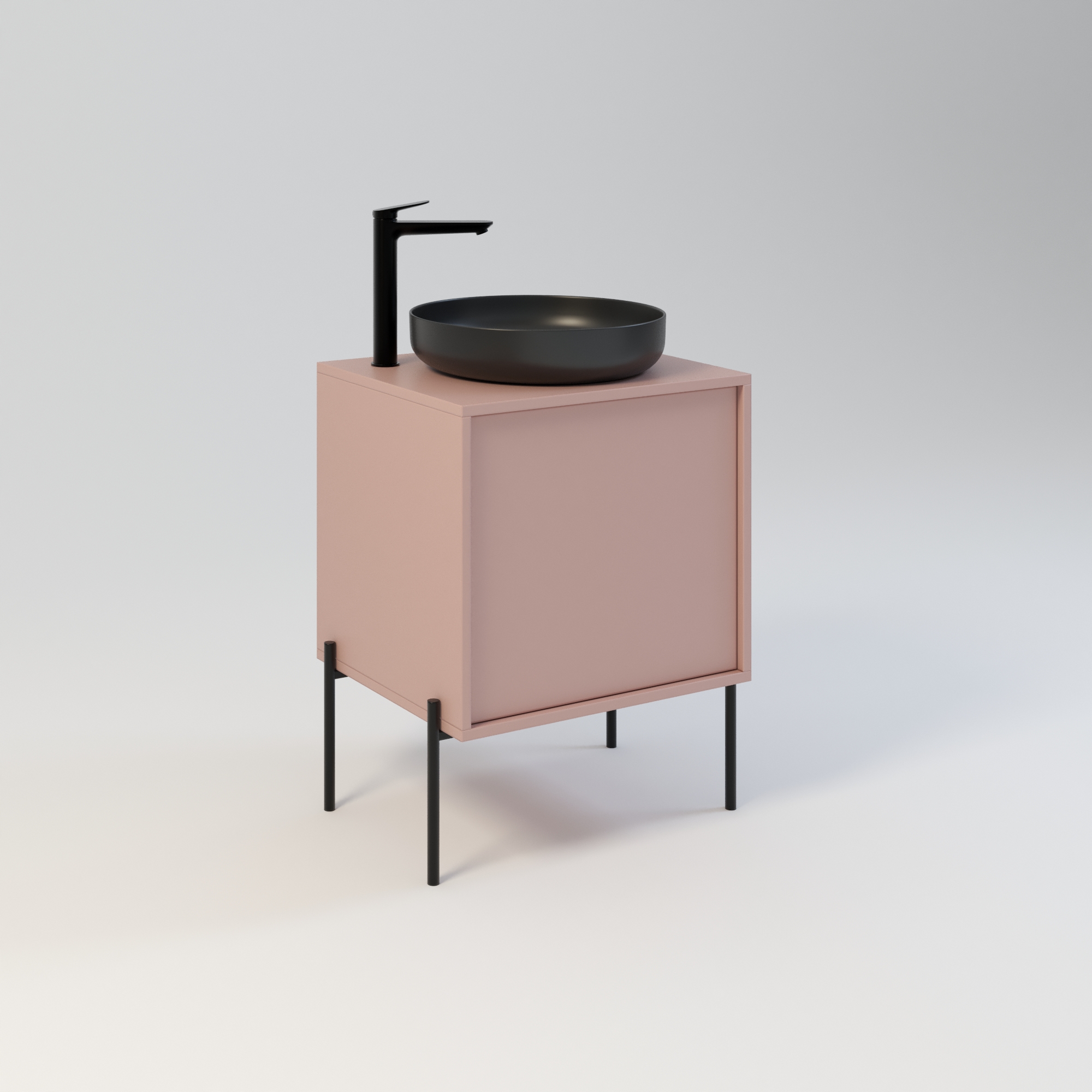 Szafka łazienkowa w stylu minimalistycznym. Zaprojektowana z myślą o osobach ceniących sobie prostotę i elegancję. Drzwi wpuszczone w korpus, otwierane za pomocą bezawaryjnych zawiasów i mechanizmu tip on. Szafka dostępna jest również w opcji z uchwytem drzwiowym. Szafka w całości wykonana z wysokiej jakości płyty laminowanej. Wewnątrz jedna półka. Szerokość szafki razem z nogami metalowymi wynosi odpowiednio 44 cm lub 54 cm. Wysokość korpusu szafki to 54 cm, natomiast wysokość metalowego stelaża / nóg to 26 cm. Regulowane stopy zapewniają idealne wypoziomowanie. Umywalka nie wchodzi w skład zestawu.