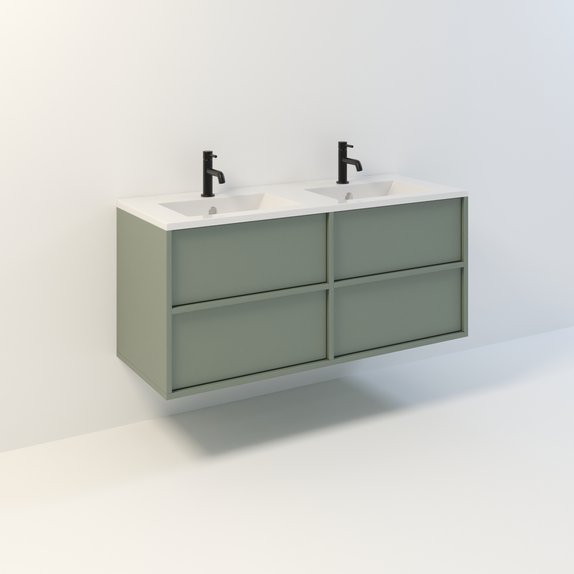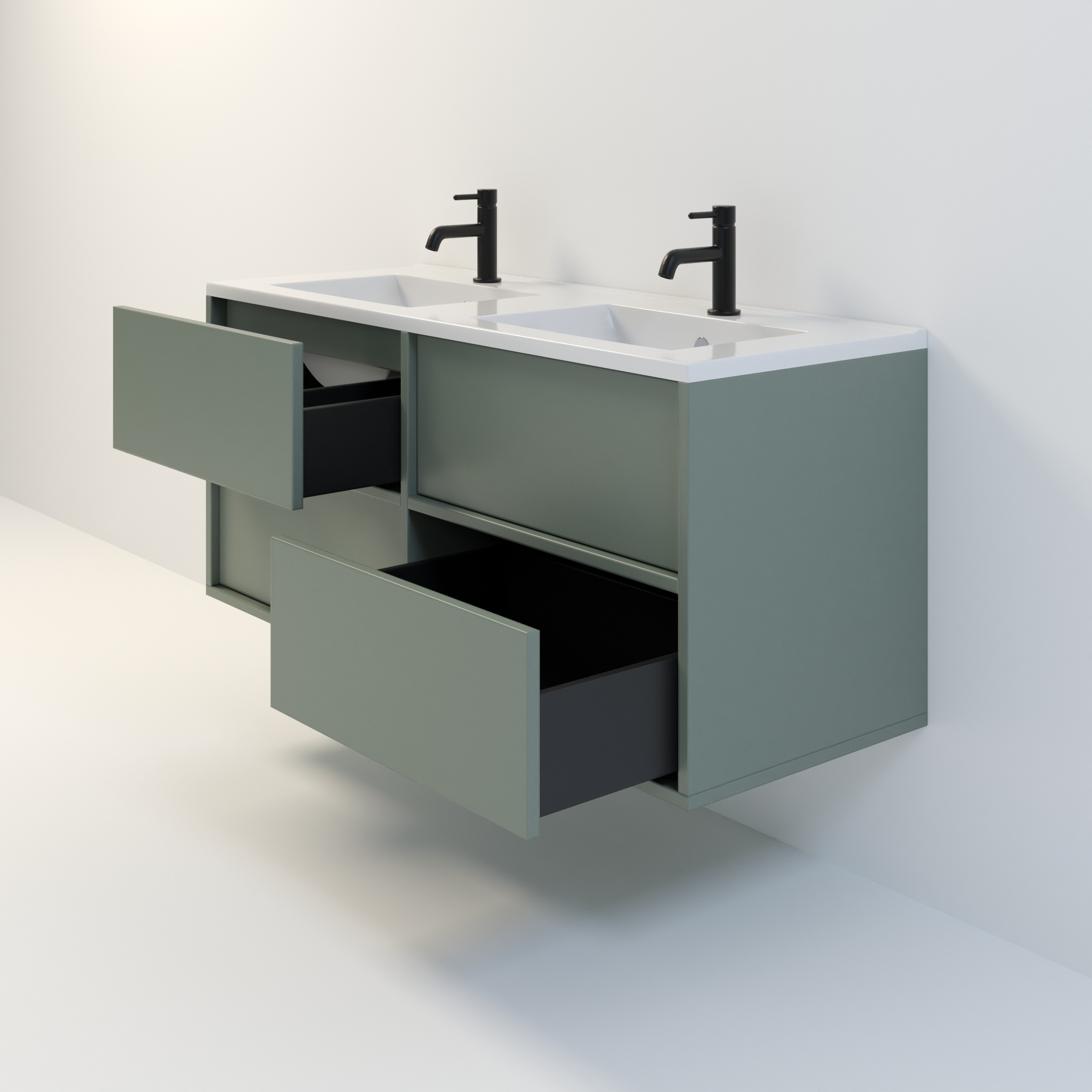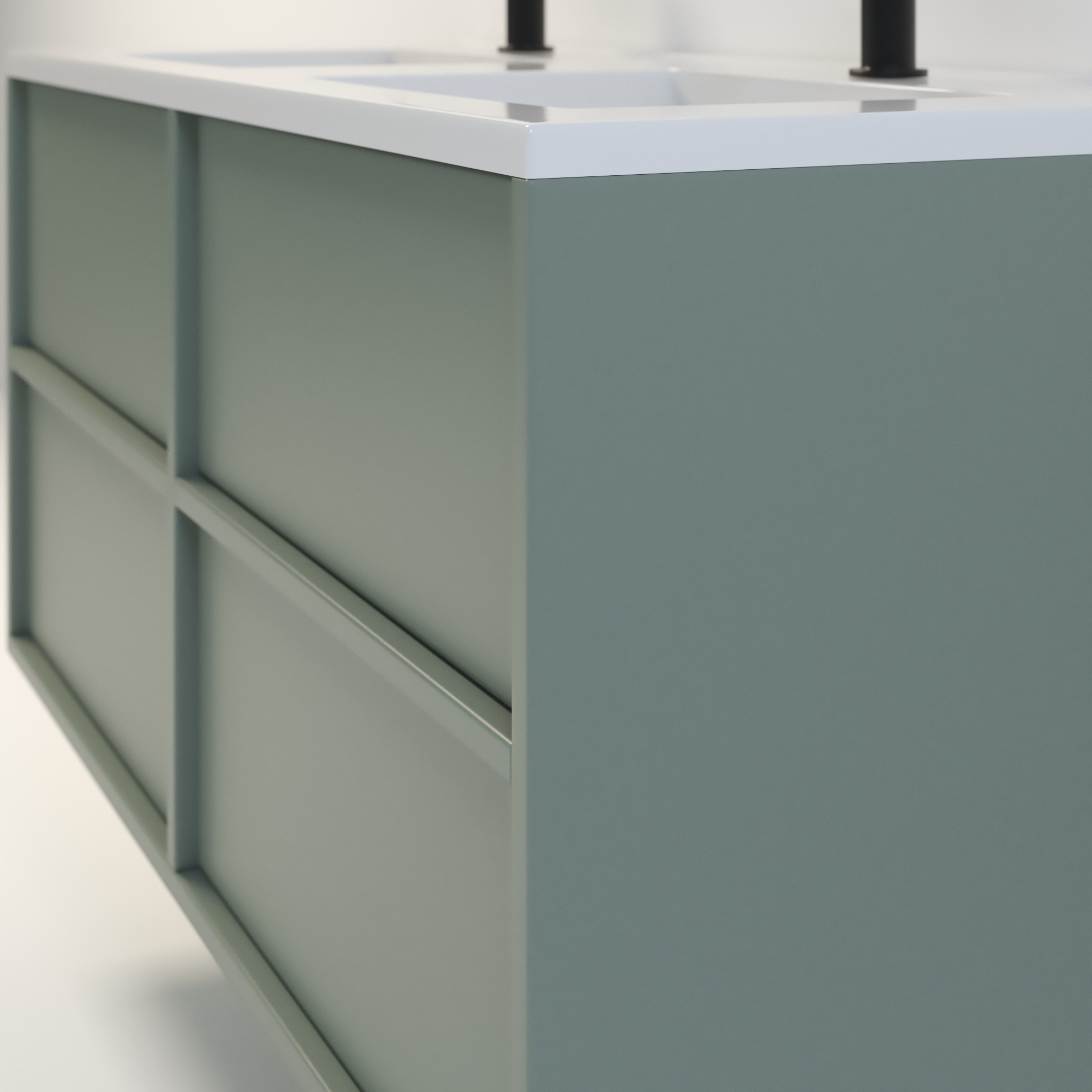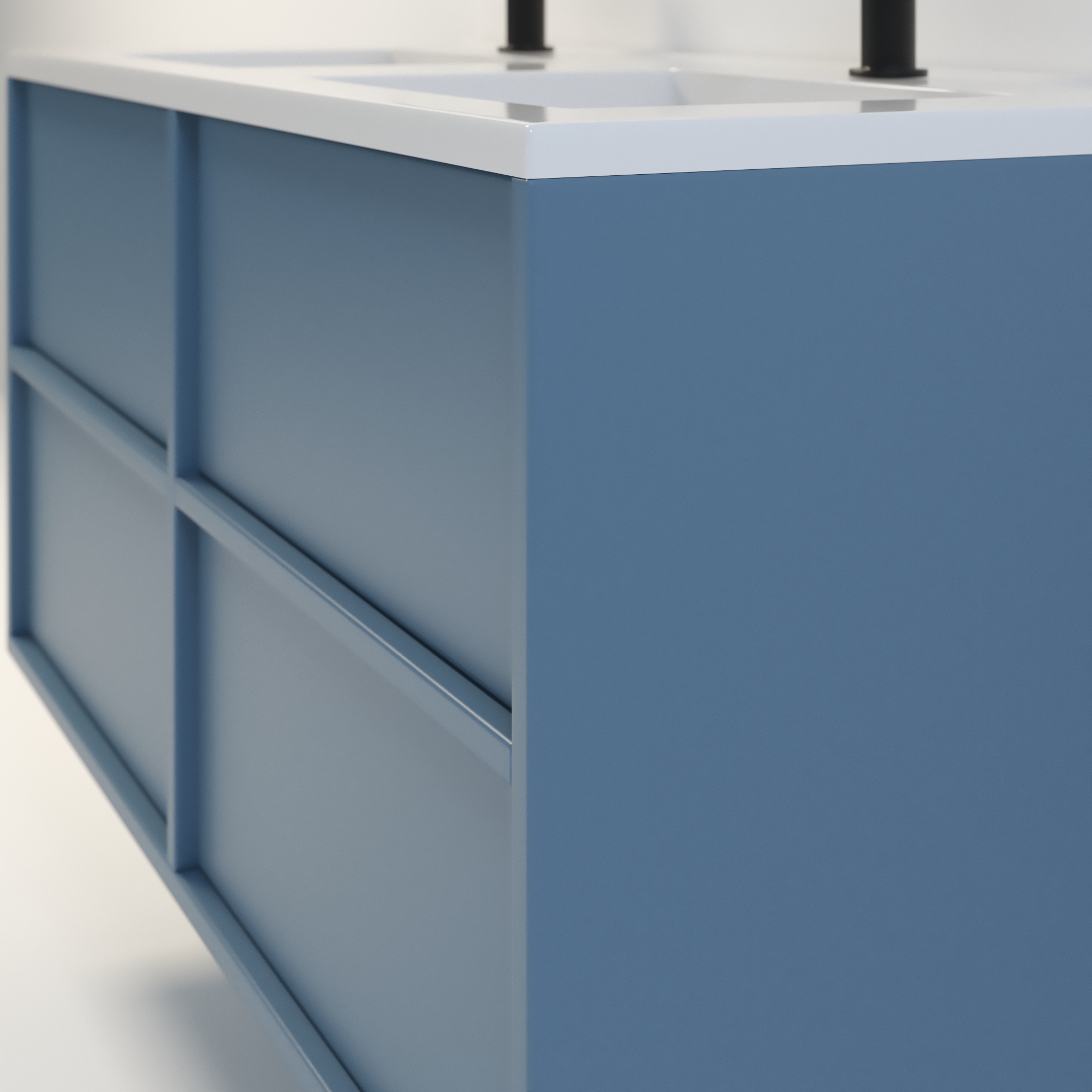 Szafka łazienkowa wisząca Minimal 4 z umywalką to nowoczesny zestaw łazienkowy który, składa się z szafki łazienkowej z czterema szufladami oraz podwójnej umywalki ceramicznej pełniącej jednocześnie funkcję blatu. Komplet ten jest niezwykle funkcjonalnym i trwałym rozwiązaniem. Połączenie uniwersalnego stylu z geometryczną formą sprawia, że szafka dobrze komponuje się w różnych aranżacjach.